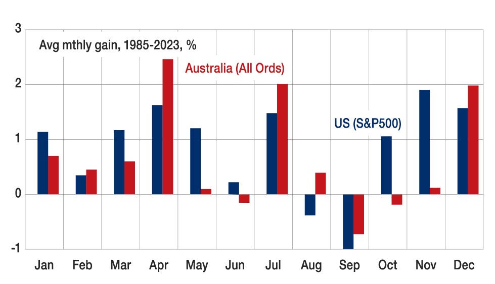Since 1985, the ASX All Ordinaries Index has seen gains in April averaging 2.4 per cent, with July averaging 2 per cent and December 1.9 per cent, which compares to an average monthly gain for all months of 0.62 per cent. But these patterns have weakened a little over time, with lower average gains in April, July, and December more recently.iii